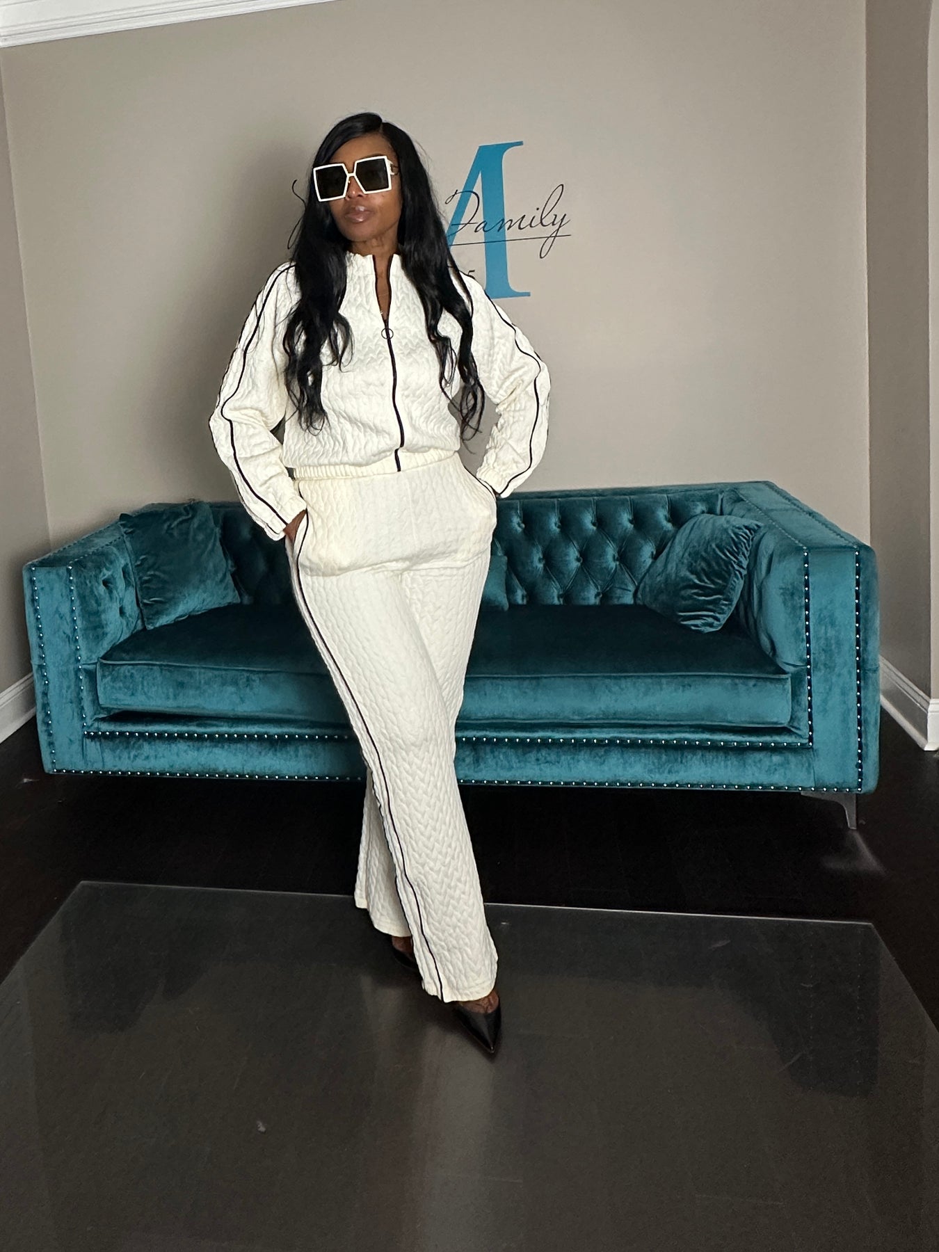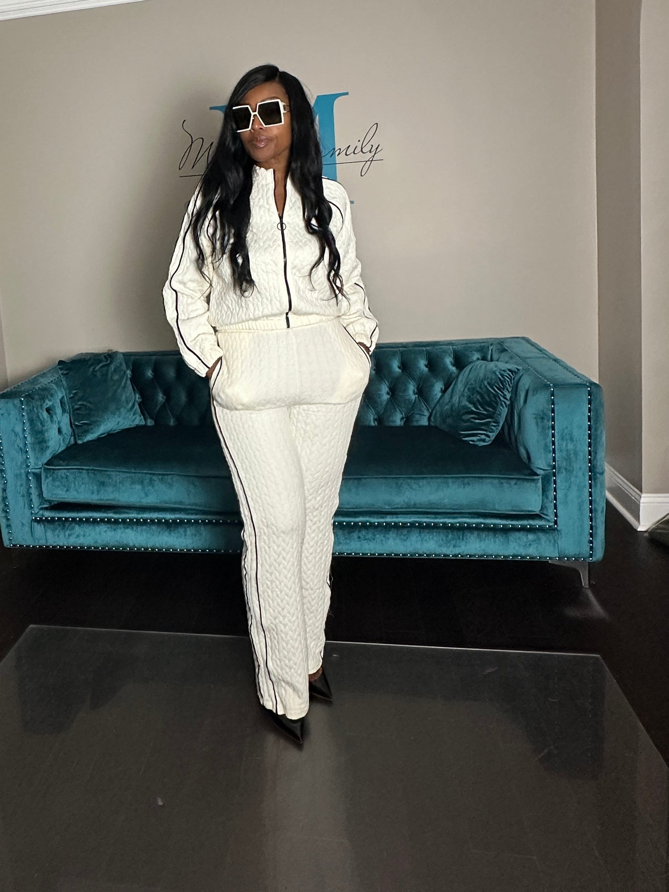 Our 2 piece Very Essential track suit set features a zip front matching hoodie with elastic waist and stripe piping detail. Jacket has a tailored look that can be worn with heels or sneakers. Set can easily be paired with heels or dressed down with sneakers.
