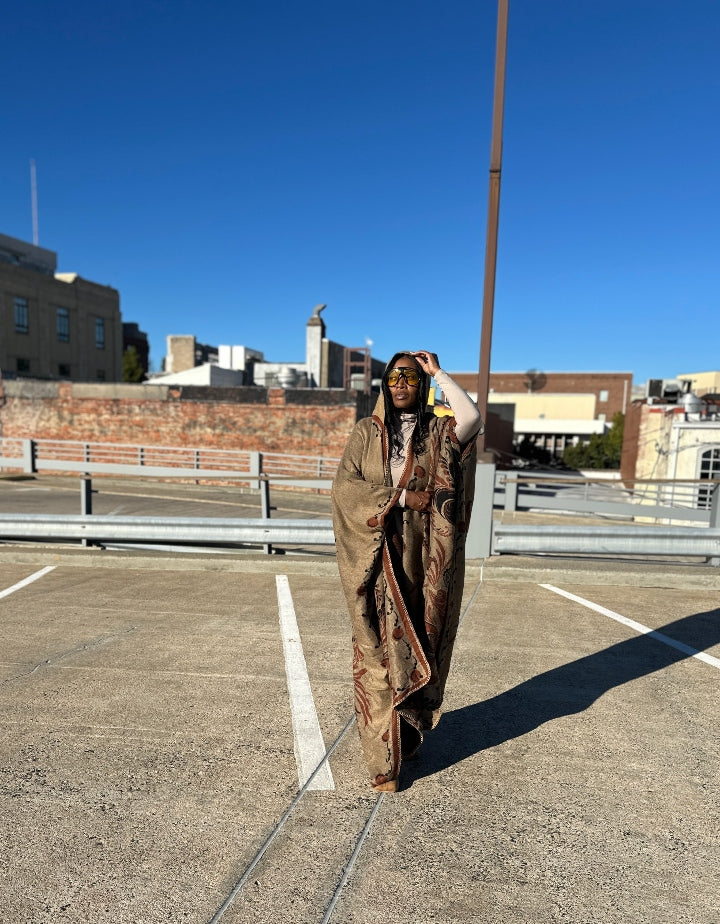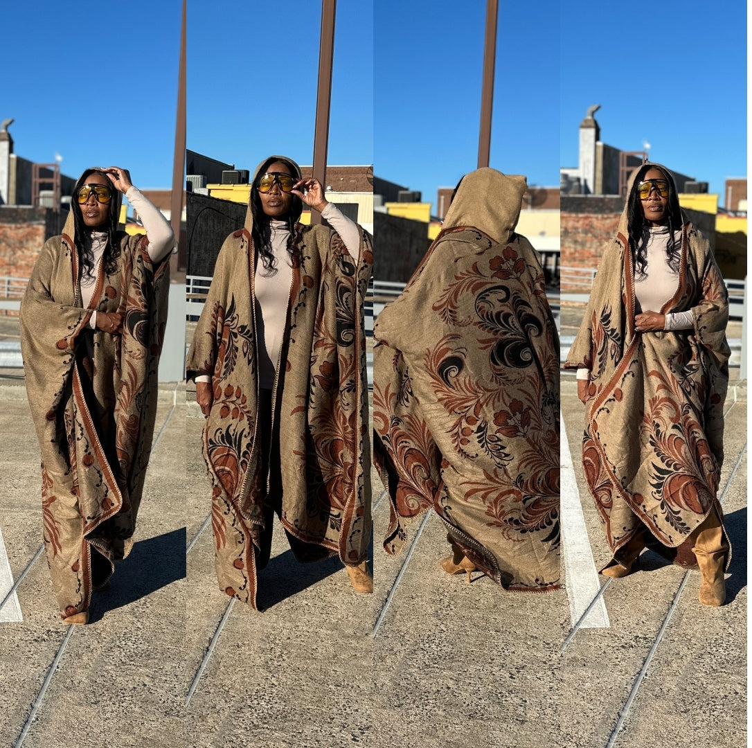 Rich Auntie at it's finest! Our fashion winter long hooded poncho is an open front statement winter coat that you will want in your closet.  One Size fits up to 4X as the sleeves are open flowy and the poncho has an open front.