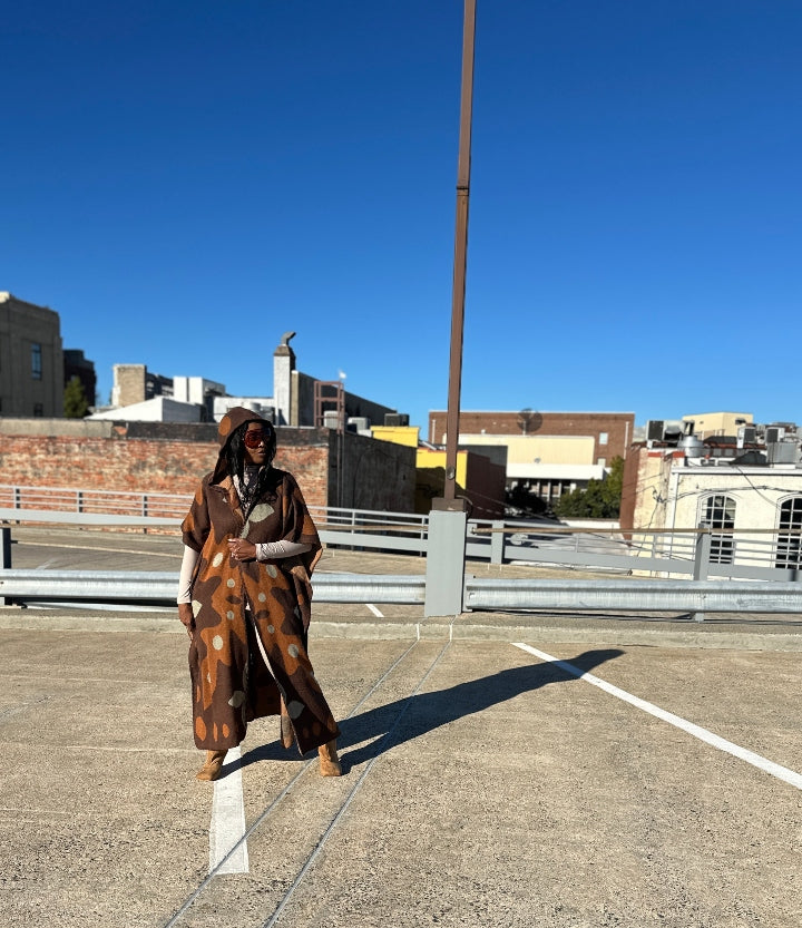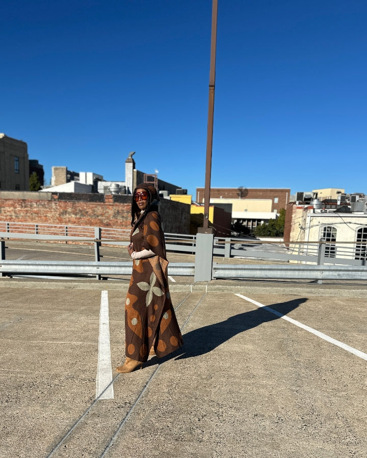 NEW Sedona Hooded Winter Open Front Poncho Printed Coat -  Chocolate Tan  Blend